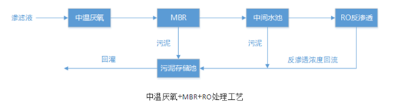 滲濾液通過調節池流入到中溫厭氧池,經大分子有機污染物降解后進入缺氧段MBR反應器中,與回流水混合進入好氧段MBR進行曝氣,去除滲濾液中的TN,好氧池出水進入MBR分離器,將分離的污泥濃液回流至MBR缺氧段,MBR出水進入反滲透系統,滲濾液經反滲透處理后實現達標排放。